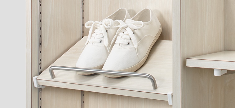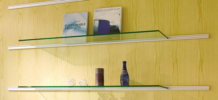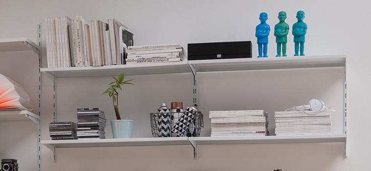 棚柱2本と棚受2ヶで棚板1枚を支え、壁面棚、可動棚がつくれます。