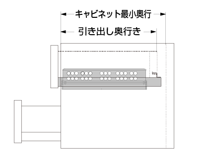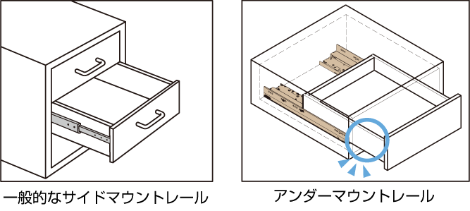アンダーマウント型のスライドレールは、引き出し底面に取り付けるため引き出しても横からレールが見えません。