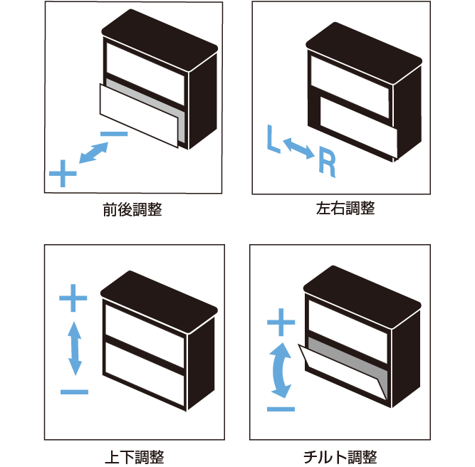 最大4方向の引き出しの位置調整機能を内蔵しており、引き出し設置後に、隙間や傾きを調整できます。