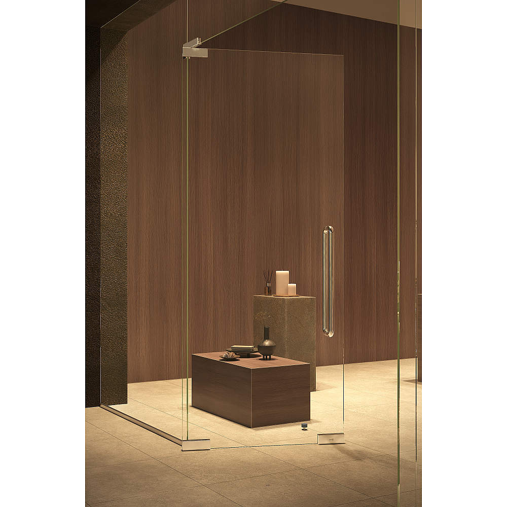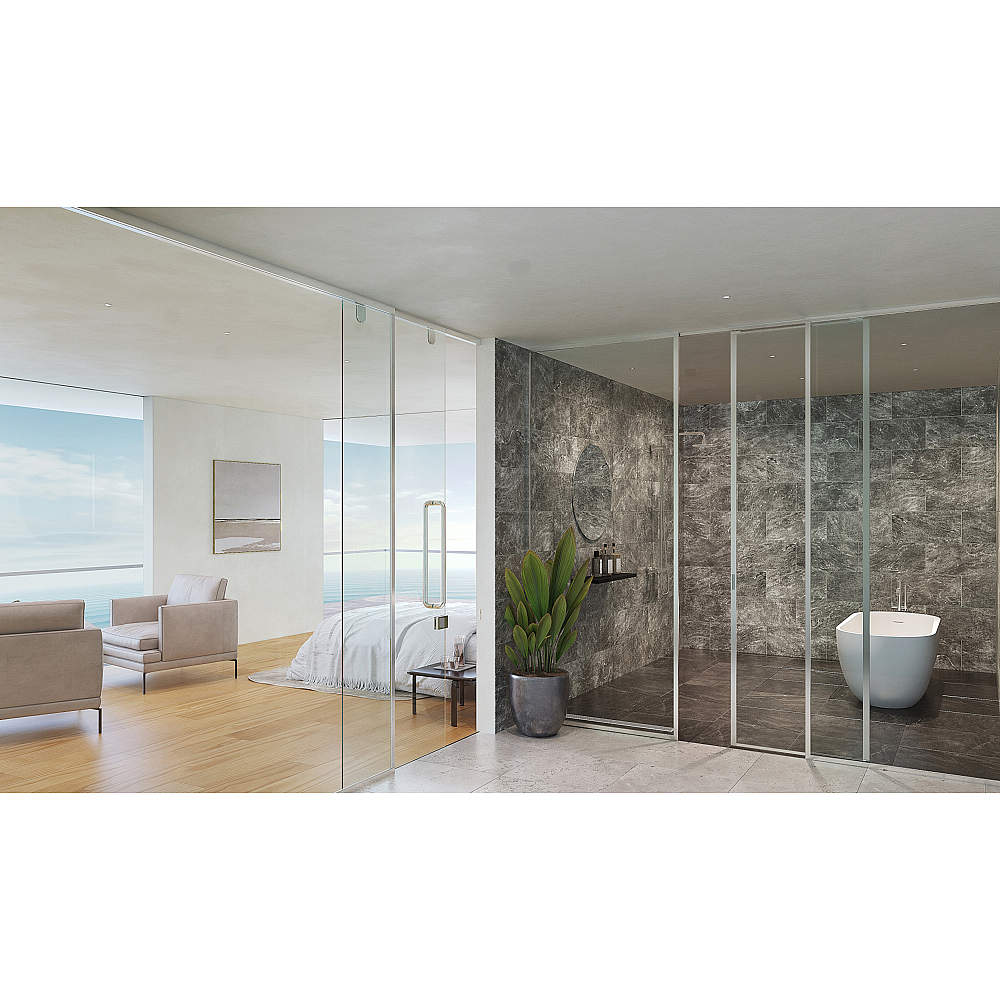 - ガラス扉を採用することで、空間がより広く見えて洗練された印象に。狭小になりがちなバスルームや洗面でも、ガラス引き戸を上手く組み合わせることで空間を広々と使用することができます。オーバーヘッドシャワーを設置する場合にも、ドアを開けてもシャワーに衝突しないガラス引き戸がおすすめです。