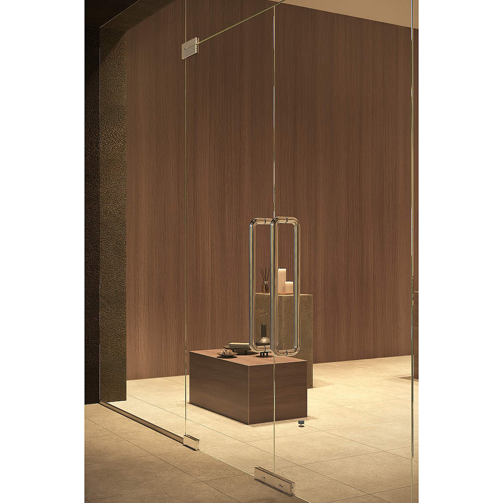 - 通りからの視線を集める全面ガラスはディスプレイを美しく魅せるショップに最適。床工事が不要な金物を使用した大型スイングドアなら、視線を妨げずに圧迫感のないエントランスに仕上がります。