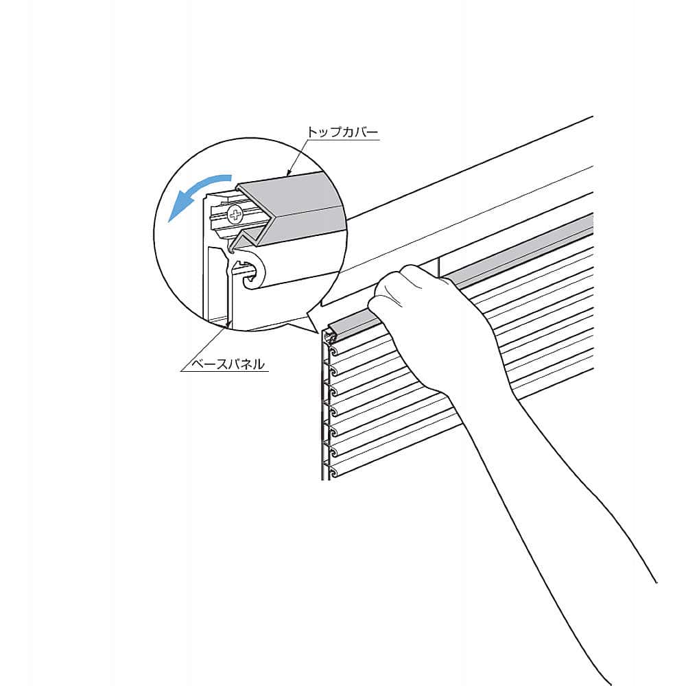 ●レイアウト変更時、フックや棚セットを移動させる際は、必ず上方に回転させて、一旦ベースパネルから外してください。その後、希望の位置より再度設置してください。