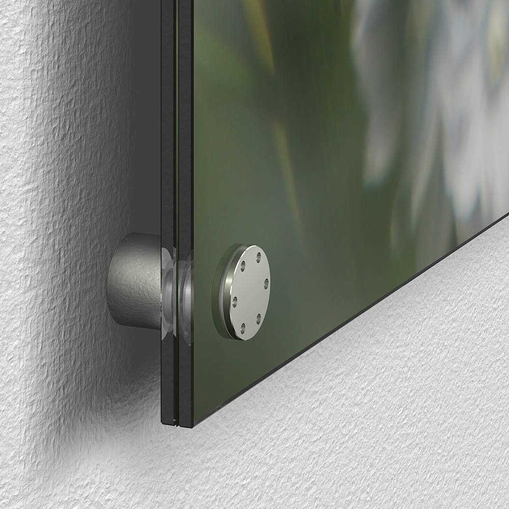- ポイントフィックスを使用することで、壁面にサインパネルを取り付けたり、什器をガラスパネルで覆って高級感を演出することができます。