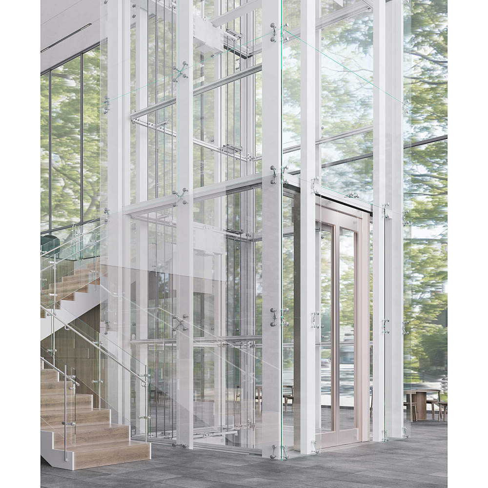 - シースルーエレベーターもスパイダーロッドとポイントフィックスを組み合わせれば、サッシ不要ですっきりした外観に。