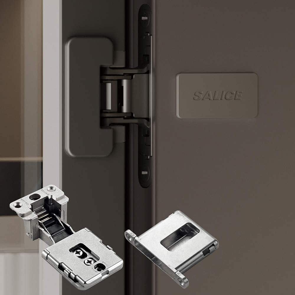 側板に掘り込んで取り付ける扉金物で、扉を開いたときも金物が目立ちません。また、壁側の金物の出っ張りがほぼないため、物の出し入れがスムーズです。