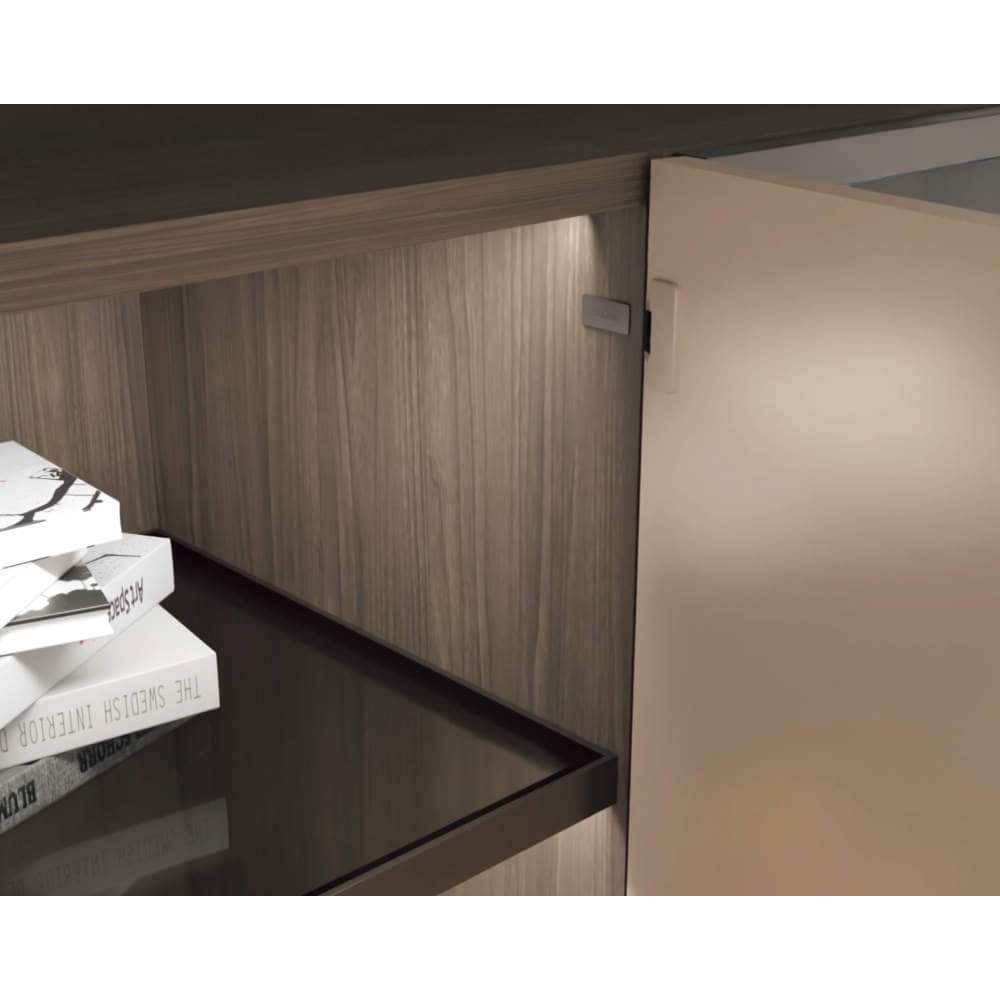 ●コンパクトかつ、キャビネットの側板に掘り込んで取り付けるため、扉を開いたときも金物が目立ちません。