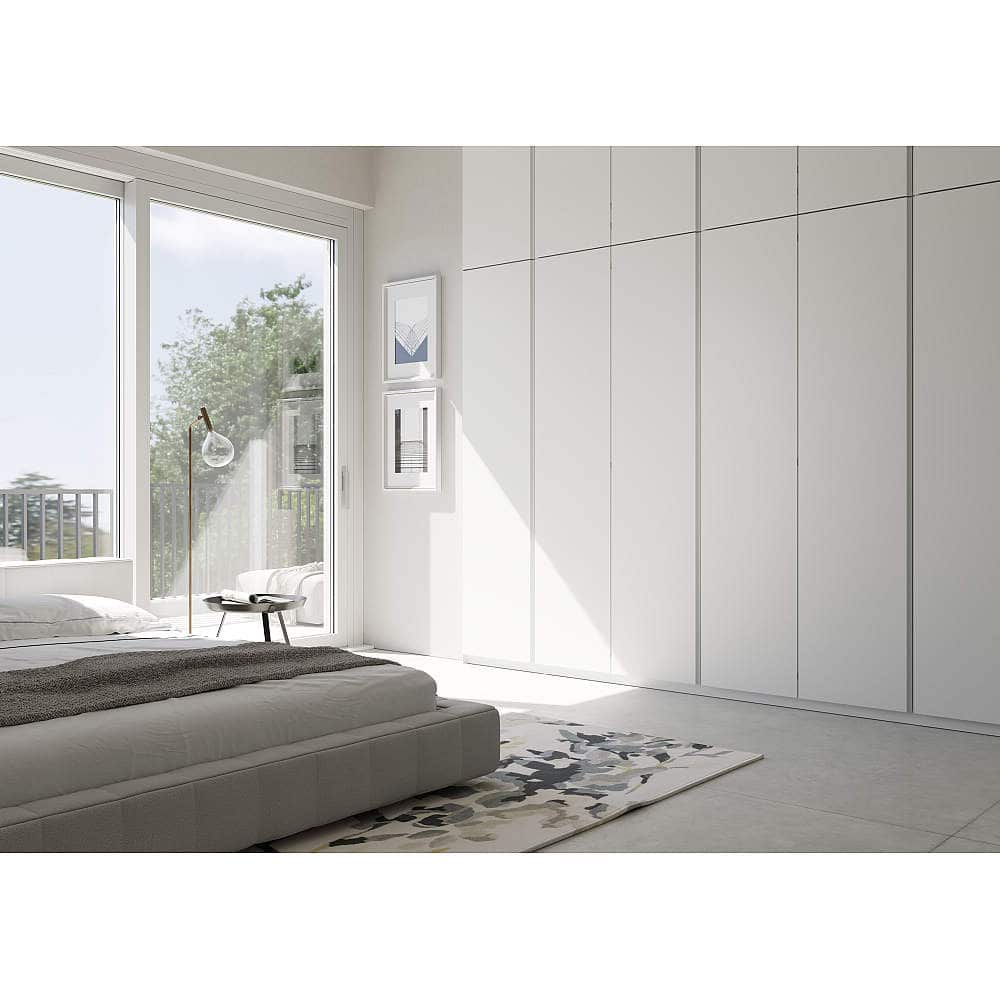 - 側板に掘り込んで取り付ける扉金物で、扉を開いたときも金物が目立ちません。また、壁側の金物の出っ張りがほぼないため、物の出し入れがスムーズです。