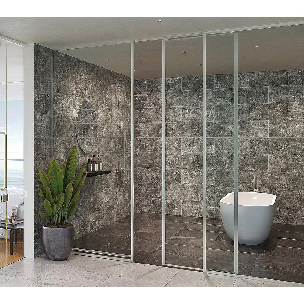 - ガラス扉を採用することで、空間がより広く見えて洗練された印象に。狭小になりがちなバスルームや洗面でも、ガラス引き戸を上手く組み合わせることで空間を広々と使用することができます。オーバーヘッドシャワーを設置する場合にも、ドアを開けてもシャワーに衝突しないガラス引き戸がおすすめです。
