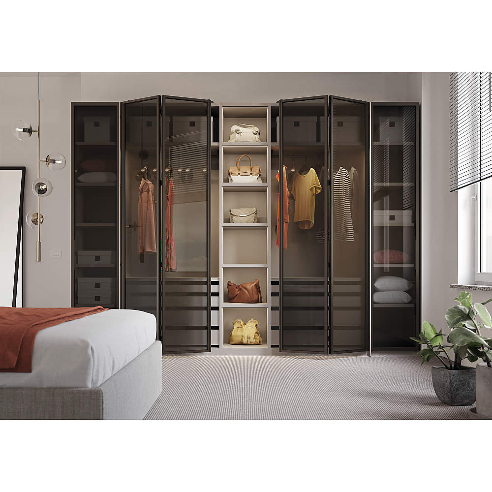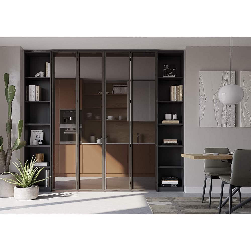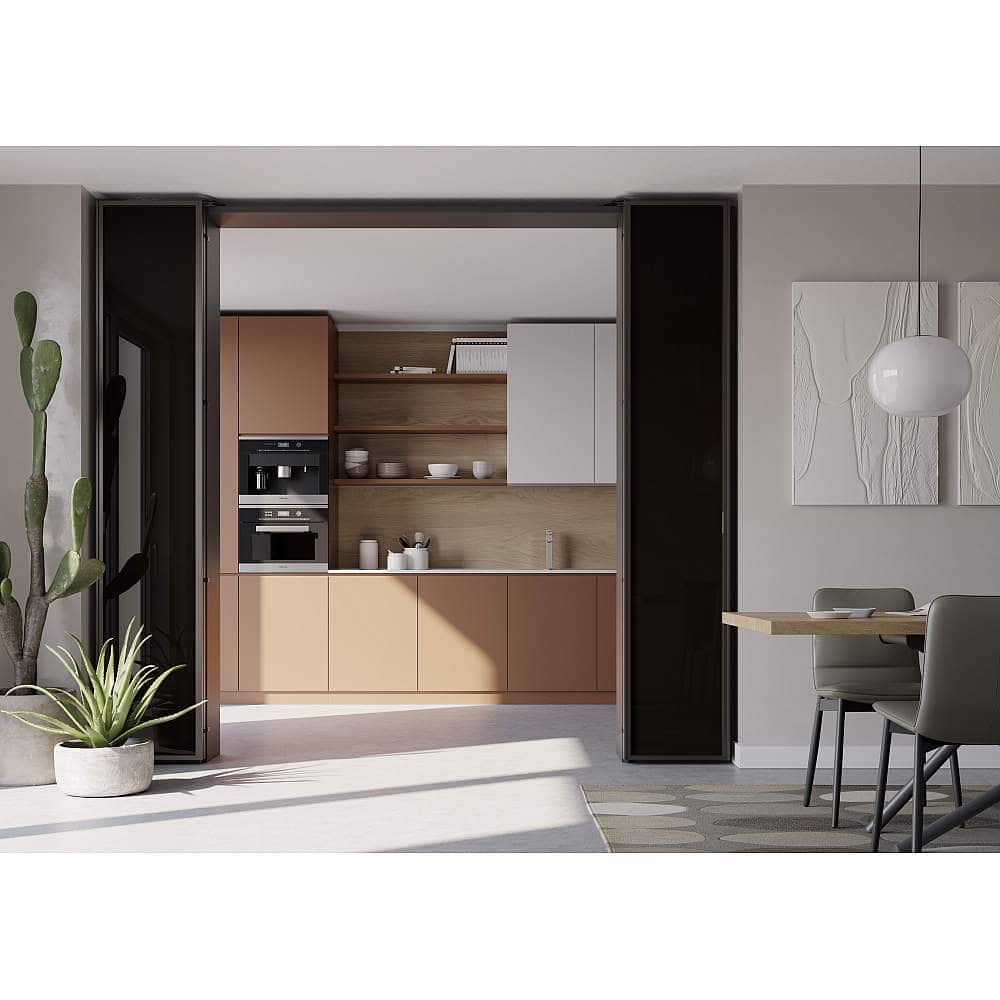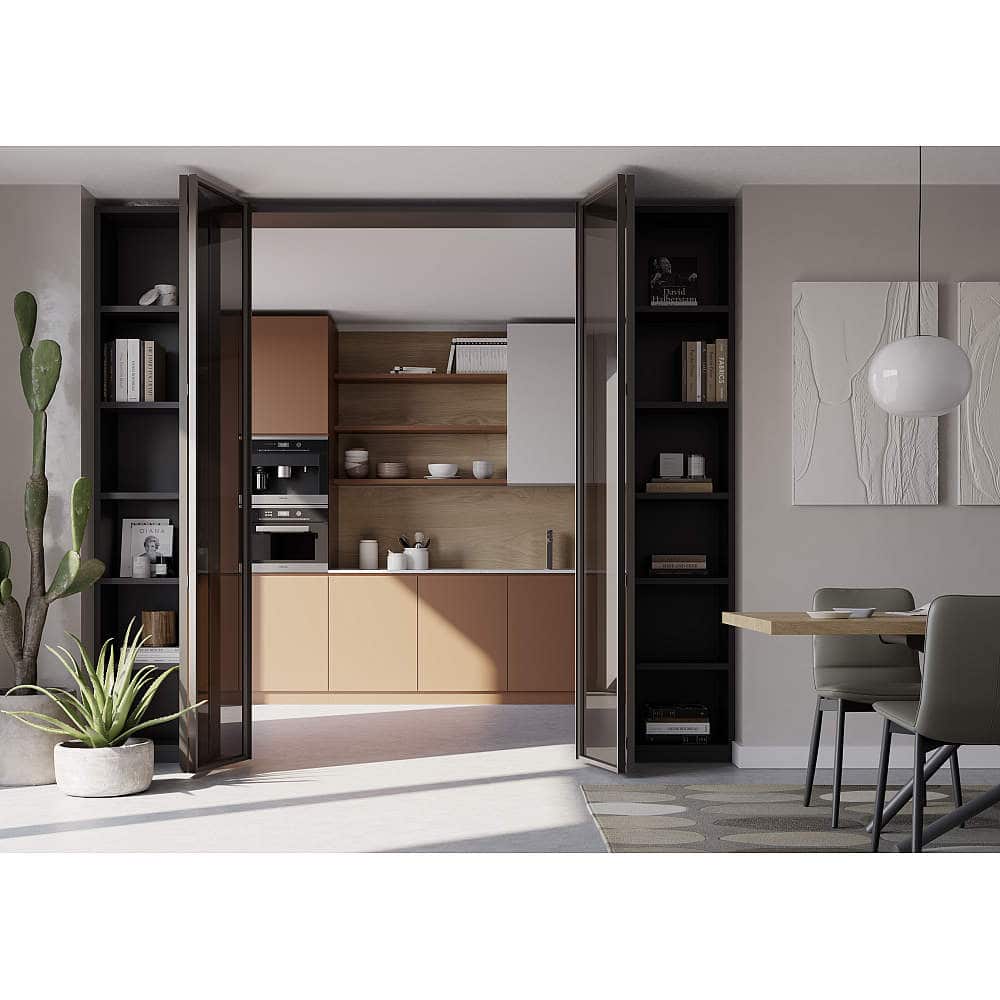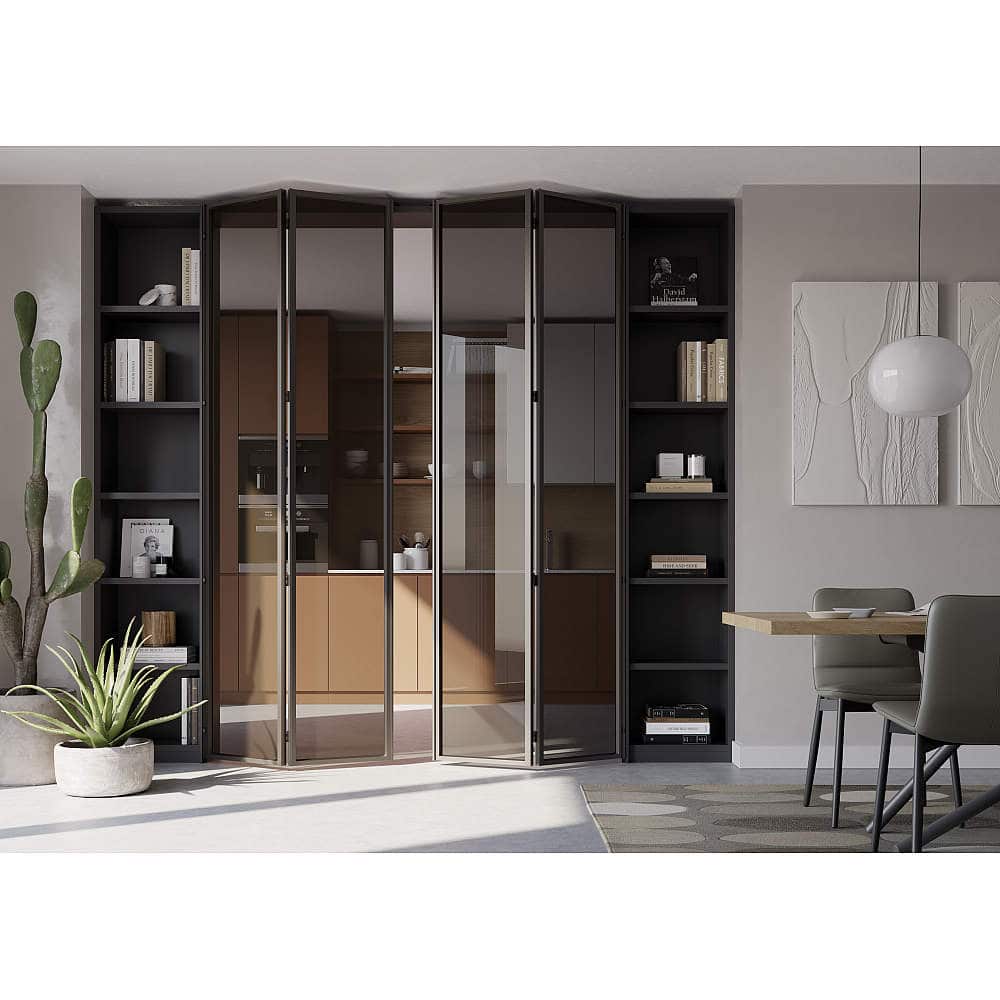 - 折戸の扉が全開時に180°まで開くため、開いた扉が動線を邪魔しません。下部に金物がないため間仕切りとして使用できます。