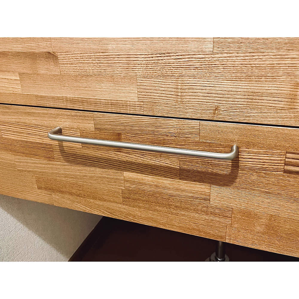 - 個人宅のラバトリーにステンレスハンドル、棚受けアングル、スライドレールを採用いただきました。木材とステンレスの組み合わせが、ナチュラルでありながらも、シックでモダンな洗面所収納を演出しています。また、ステンレスの仕上げの美しさや、製品自体の丁寧な作りも高く評価いただきました。