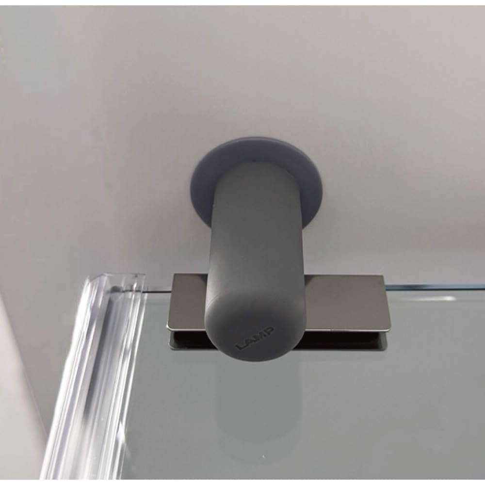 - グラビティー丁番、L型ハンドル、天井付戸当りを使用したシャワールームです。丁番は開き角度約70°以下でドアの自重によって閉まり、閉じ際の力を強めているため、換気扇によるドアの開きを軽減できます。施工現場に多少の傾きがあっても閉じた状態を保つ効果も期待できます。約70°以上開くと手を離しても自動的に開くため、掃除の際に便利です。L型ハンドルはタオル掛けとしても使用できます。戸当りは天井付タイプのため壁付より開き角度の設計を自由に行え、ハンドルの出っ張りに合わせた細かな調整が可能です。#シャワーブース