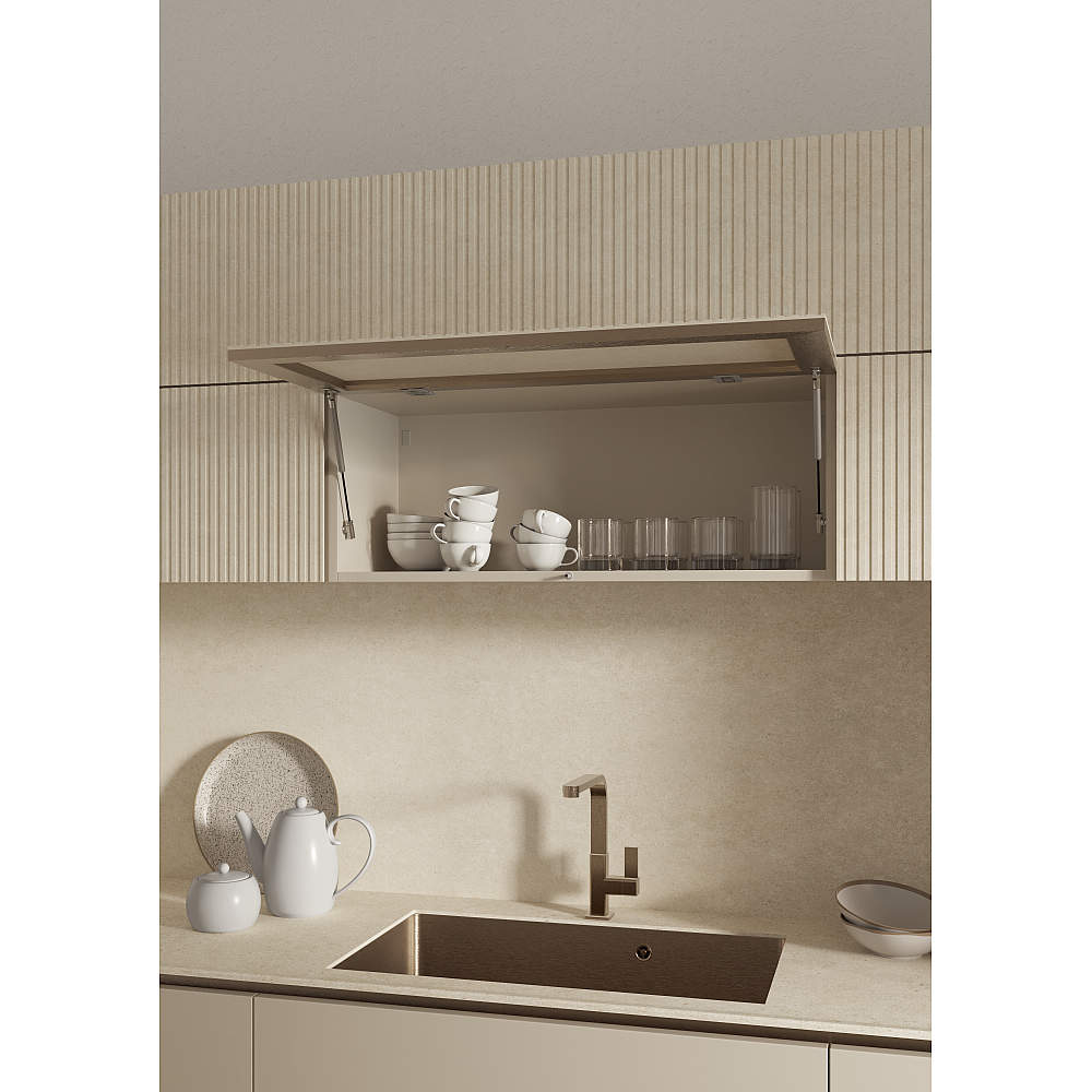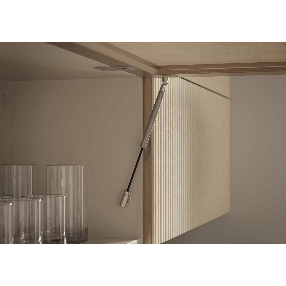 - φ12とスリムなガススプリングのため、インテリアの邪魔をしないコンパクトな納まりが可能です。プッシュラッチと併用してプッシュオープンにすることで、ハンドルレスの扉にできます。