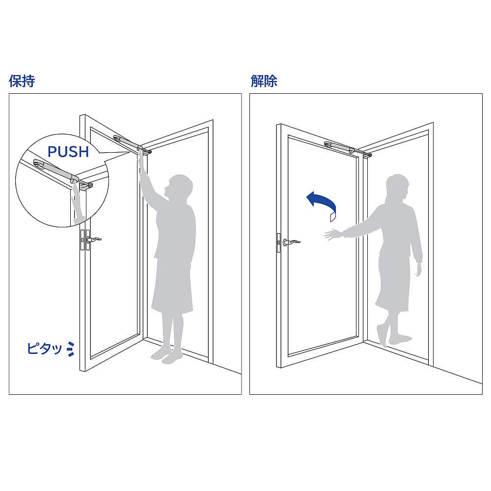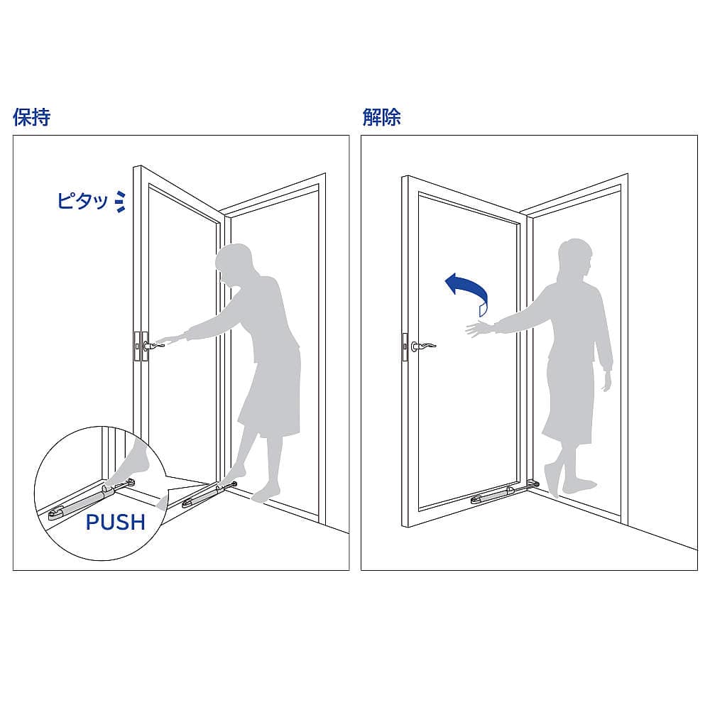 ●任意の位置で扉を保持できるオープン保持機能付きで、扉を開く方向に動かすと保持解除になります。