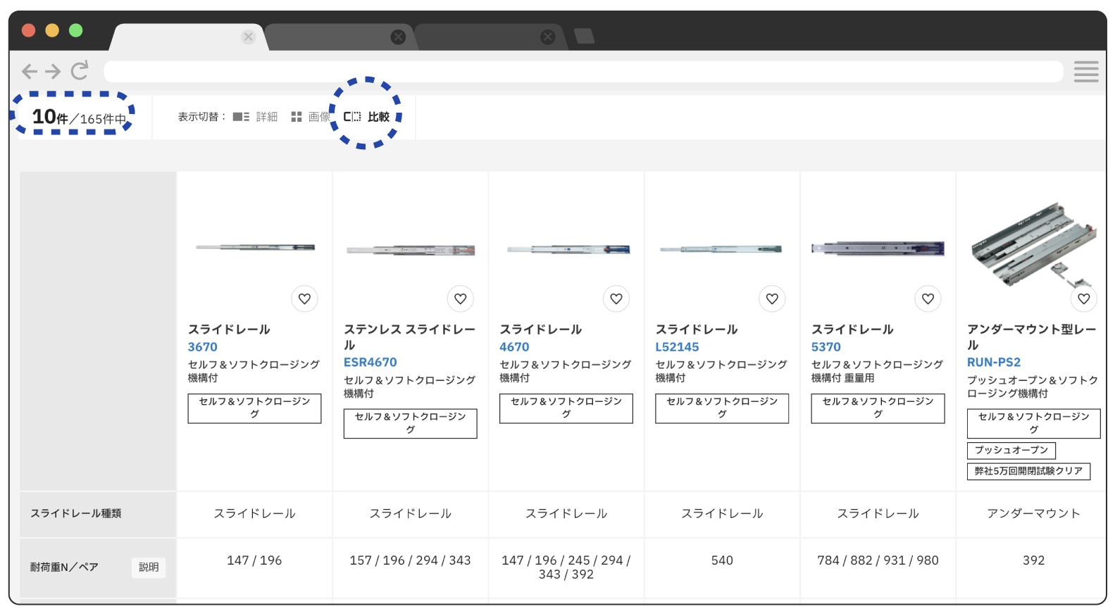 キーワード検索に加え、「仕上(色・素材)」「製品寸法」「耐荷重」「取付位置」など、具体的な条件で絞り込みが可能です。また、検索結果は写真付きで一覧表示され、比較検討も容易になり、選定時間の短縮に貢献します。