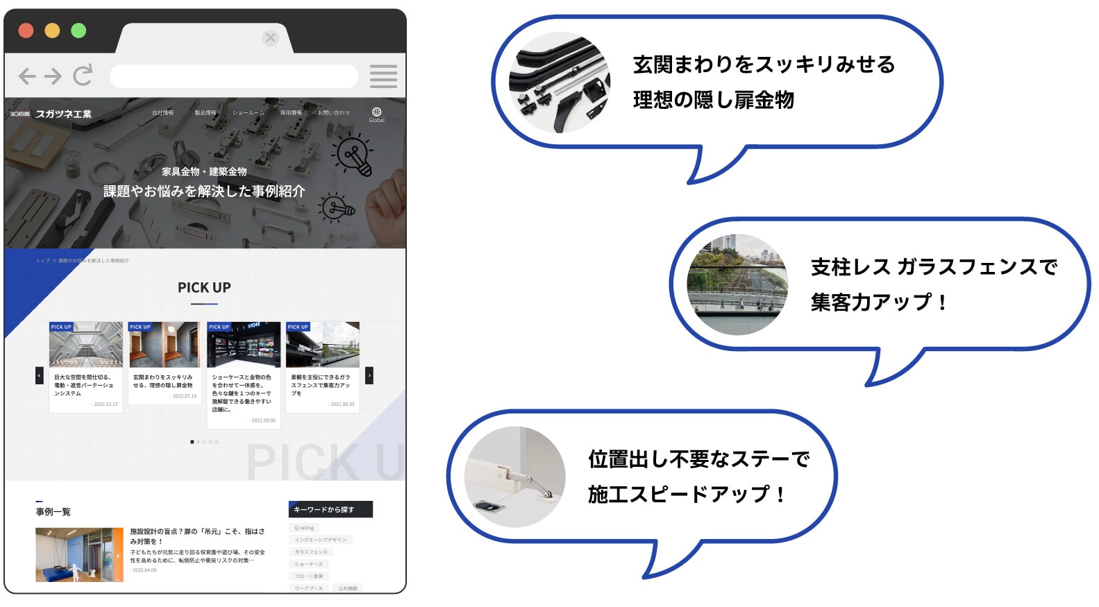 スガツネの施工例サイトでは製品名や仕様が分からなくても、どこで・どう使いたいかという視点から製品をお探しいただけます。