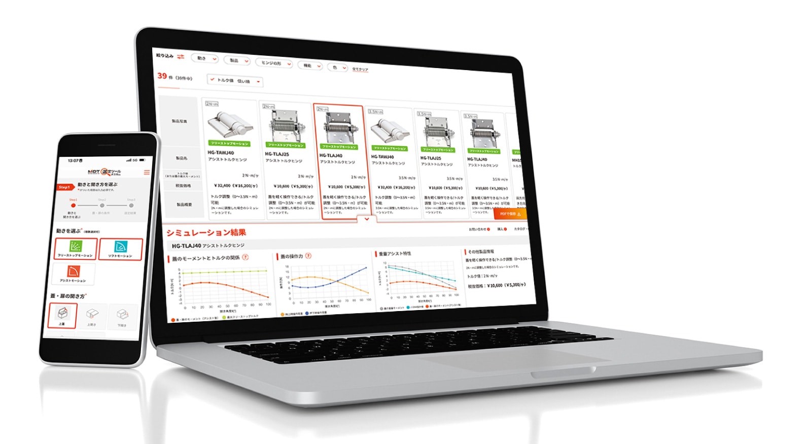 お客様が検討中の製品条件入力すると簡単に製品選定できるWEBサイトをご用意しています。選定や計算が難しいダンパーヒンジやトルクステーの選定ツールをはじめ、LEDライトを使うために必要な部品の拾い出しツールや加工図を自動生成するアンダーマウント設計・製造支援ツールなど。より細やかにお客様の選定・設計のお手伝いします。