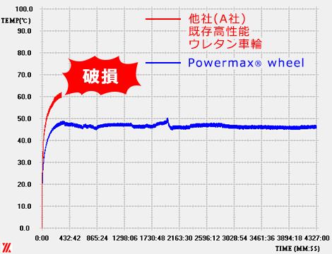Powermaxは、亀裂・剥離が一切発生せず、従来品は5時間以内に温度が60℃以上上昇し破裂した。