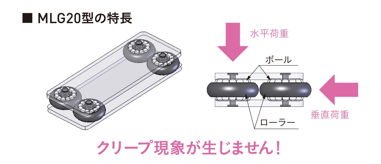 樹脂ボディに8輪のローラーを独自の位置で配置することでFx方向だけでなく、Mz方向の偏荷重を安定して受けられます。